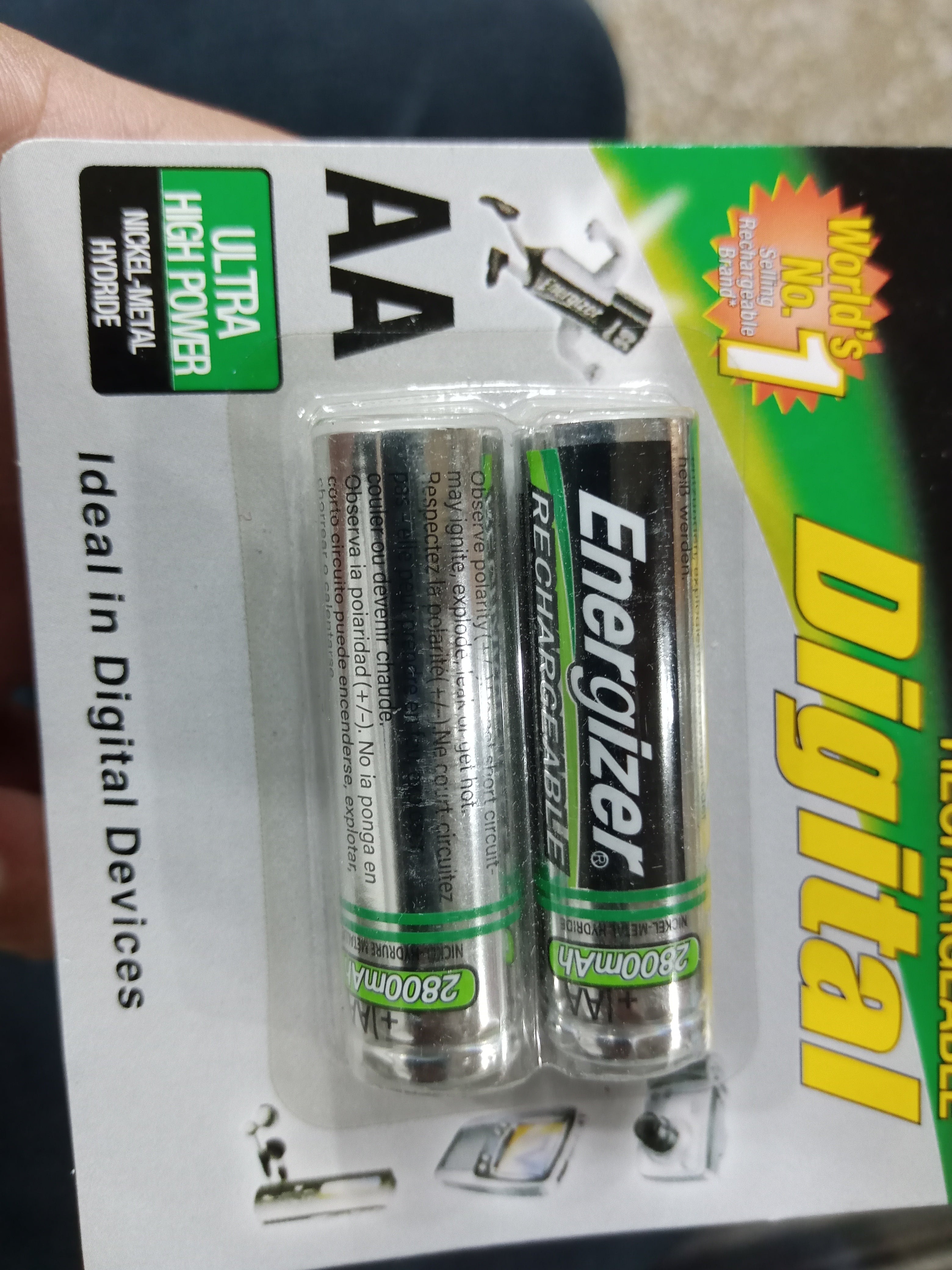 Power your devices with Energizer Rechargeable Digital AA Batteries, designed for long-lasting performance and reliability. With an ultra-high capacity of 2800mAh, these Nickel-Metal Hydride (NiMH) batteries are perfect for powering digital cameras, flashlights, remote controls, toys, and other high-drain devices.